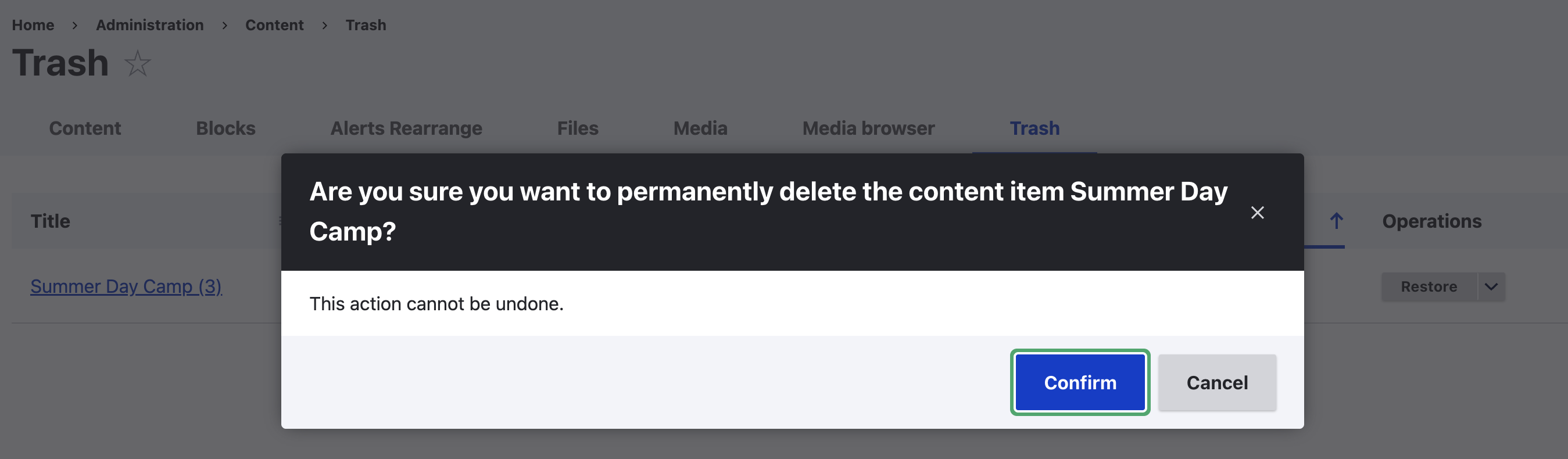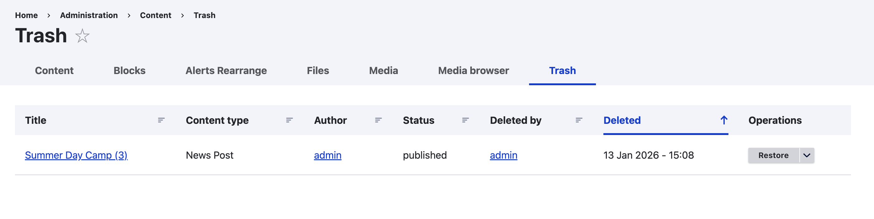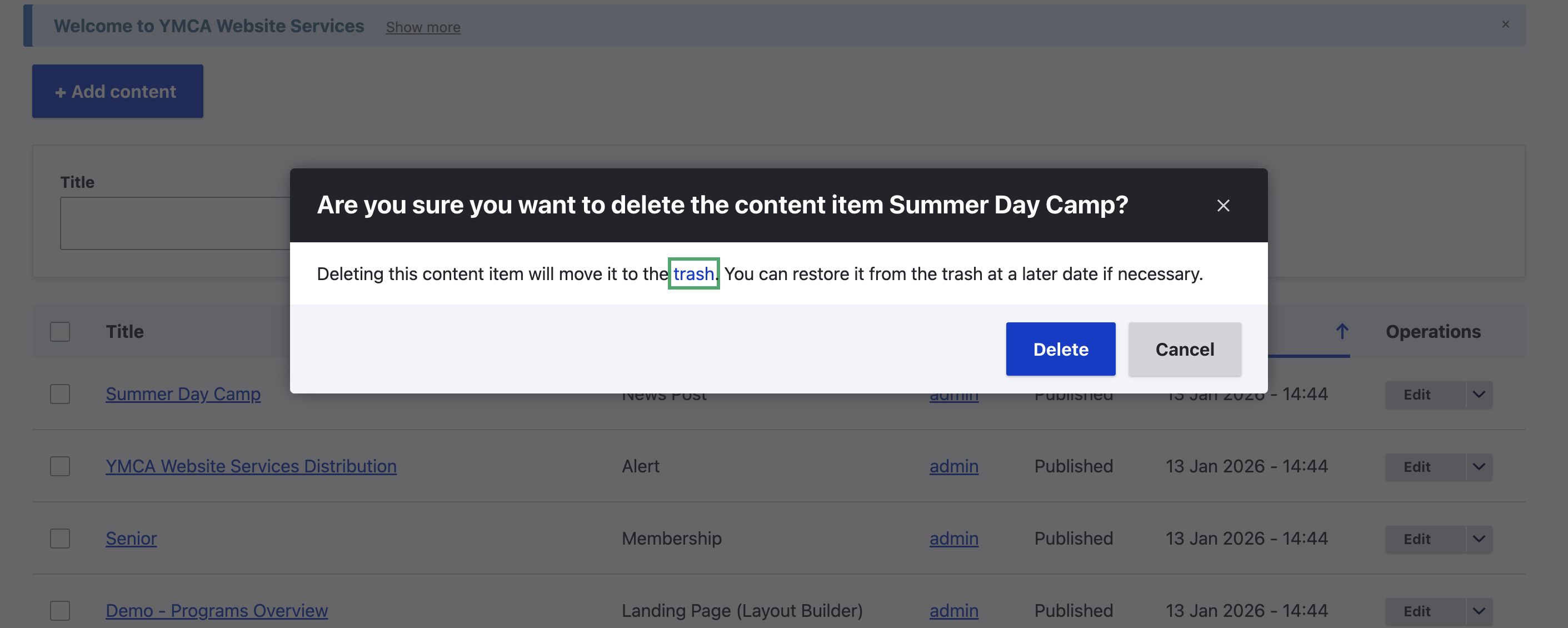 The Trash module adds a trash bin for content entities in your YMCA Website Services site. When editors delete content, it isn’t immediately removed from the database. Instead, it’s moved to a trash storage area where it remains until either: